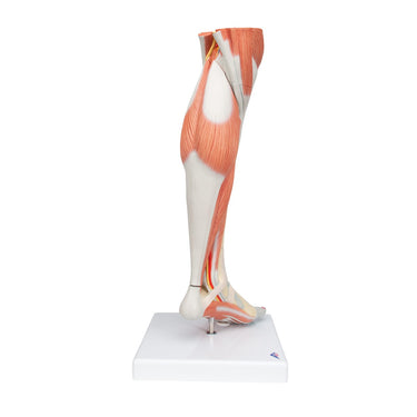 Este modelo de tamaño natural se separa horizontalmente en la articulación de la rodillla, de forma que permita observar las estructuras de la articulación. Los músculos gemelos son desmontables. Sobre soporte.