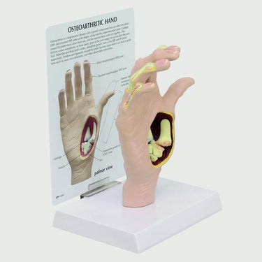 El modelo de mano con osteoartritis representa una mano derecha a tamaño real con sección perpendicular para la observación de los efectos de dicha enfermedad, incluye: osteofitos (excreción ósea), nódulos de Heberden y Bouchard, deformidad cuello de cisne del pulgar. Muestra el resto de la anatomía afectada por la osteoartritis: ligamentos, tendones, músculos y cartílagos. Con el fin de comparar, también muestra la anatomía normal.