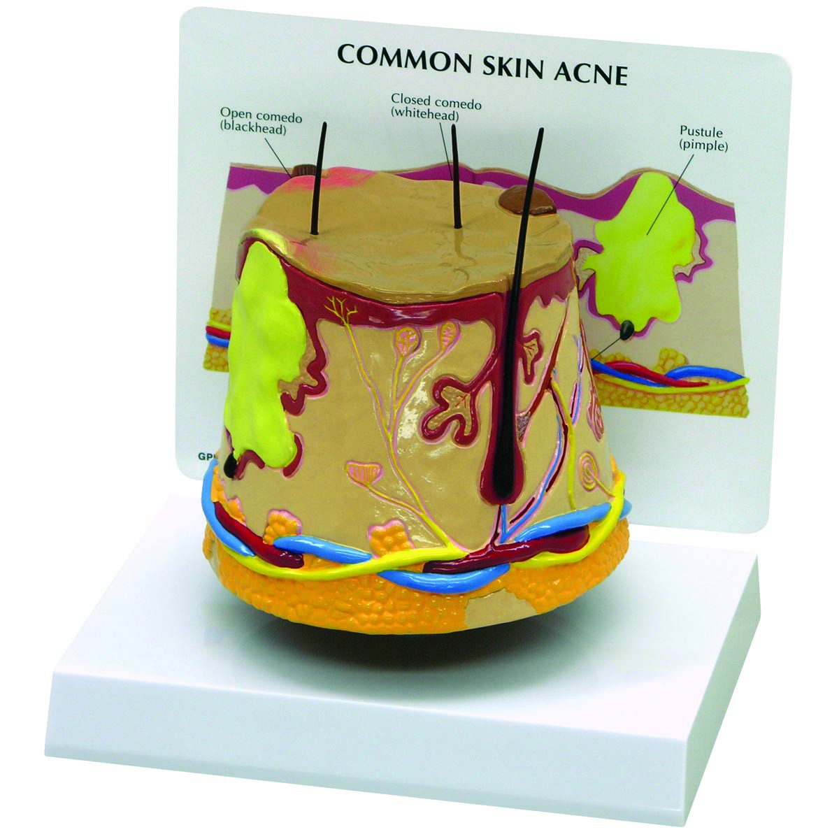 El modelo de acné cutáneo es una sección transversal cilíndrica ampliada de la piel que refleja tres patologías: pústula acneica (grano), comedón cerrado (punto blanco) y comedón abierto (punto negro) en el lado opuesto. También aparece una sección normal de la piel con la epidermis, la dermis y el tejido subcutáneo, con el folículo capilar incluido.