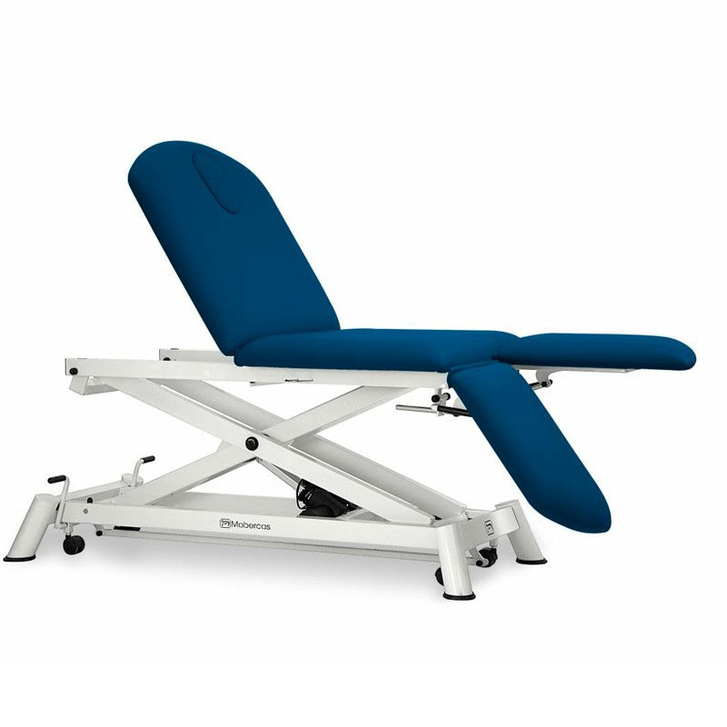 Camilla eléctrica tipo sillón con regulación de altura mediante mando de mano, subida recta sin desplazamiento lateral, perneras independientes elevables/reclinables, tapón facial y ruedas escamoteables. (CE-0135-PR.62 / CE-0135-PR.70)
