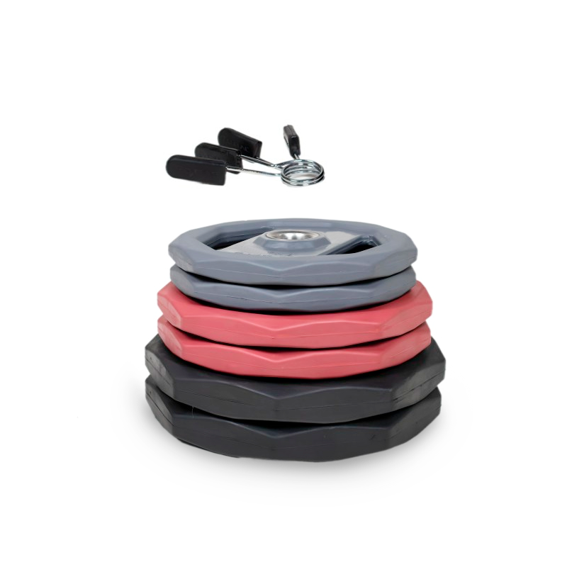 Discos: con 3 huecos para un agarre fácil y seguro, y diseño que evita la rodadura por el suelo. Color codificado para identificar el peso fácilmente. Con anilla central en PVC que facilita la introducción de los discos al mismo tiempo que previene el desgaste.