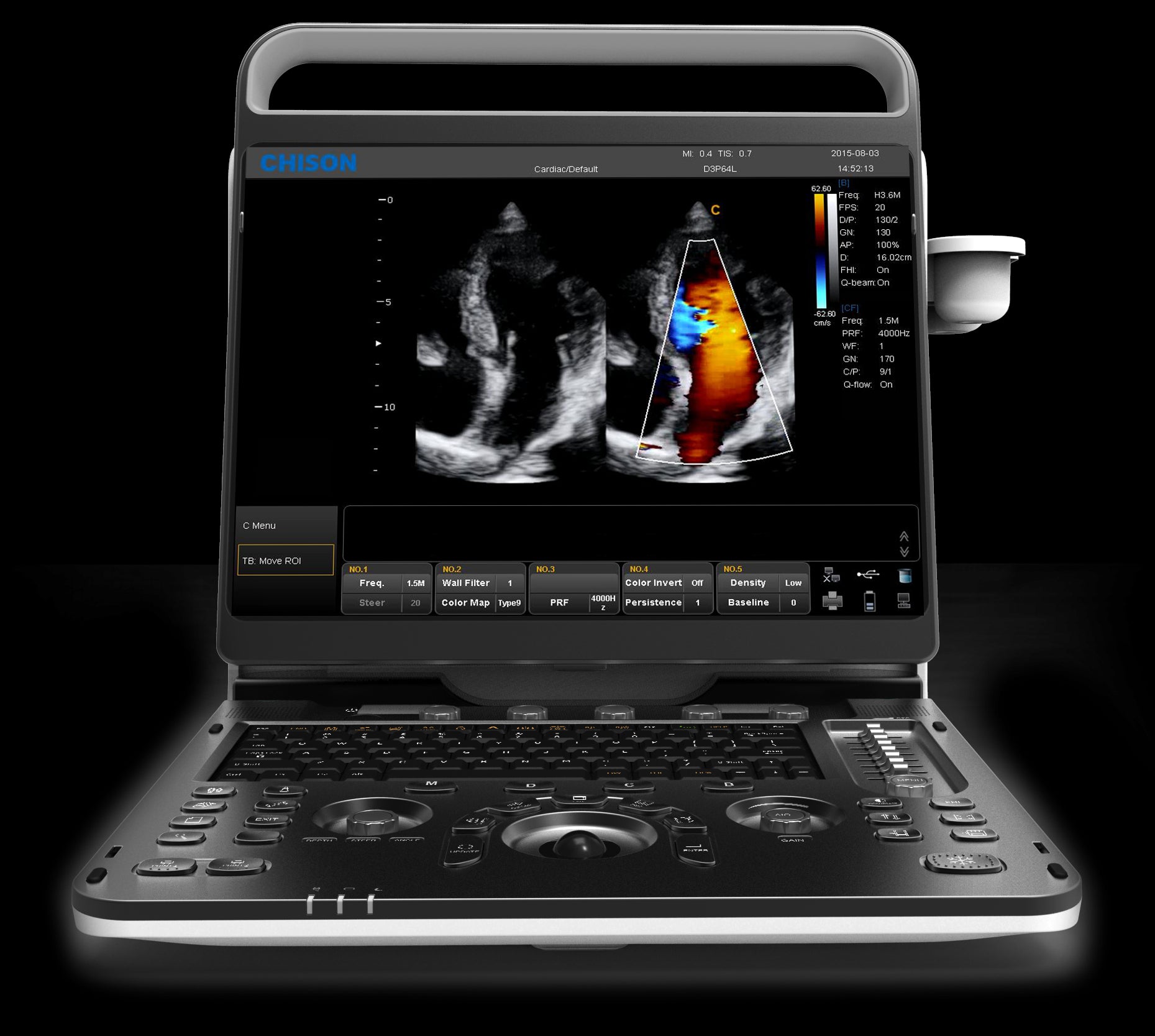 El sistema de ultrasonido está equipado con una batería reemplazable que permite un tiempo de trabajo continuo de 120 minutos, además, también incluye las últimas tecnologías de imagen como FHI, que utiliza múltiples modos de transmisión y recepción basados en el tamaño y el peso del paciente, para mejorar la resolución sin pérdida de penetración; el Q-flow, que maximiza automáticamente la sensibilidad del color y el ruido en función de los diferentes tejidos; la última innovación en 4D en tiempo real con un potente motor de imágenes y una fuente móvil de luz virtual (para su uso es necesario adquirir la sonda 4D y la licencia de software, con coste adicional); elastografia, que muestra la rigidez del tejido en tiempo real para proporcionar a los doctores información de diagnóstico adicional a la hora de estudiar órganos como el hígado o los pechos; Q-beam, que duplica el volumen de la señal, aumentando la resolución de las imágenes y produciendo velocidades de fotogramas más altas, lo que garantiza una mayor eficiencia en el diagnóstico, especialmente de órganos en movimiento; X-contrast, que con un solo toque ajusta la resolución del contraste a tres niveles.