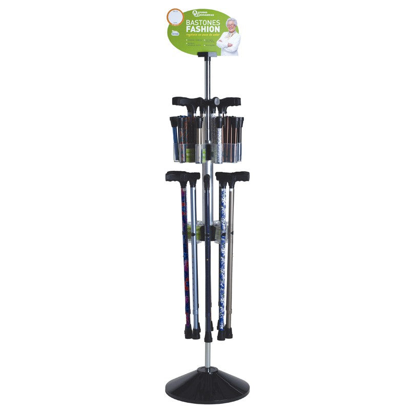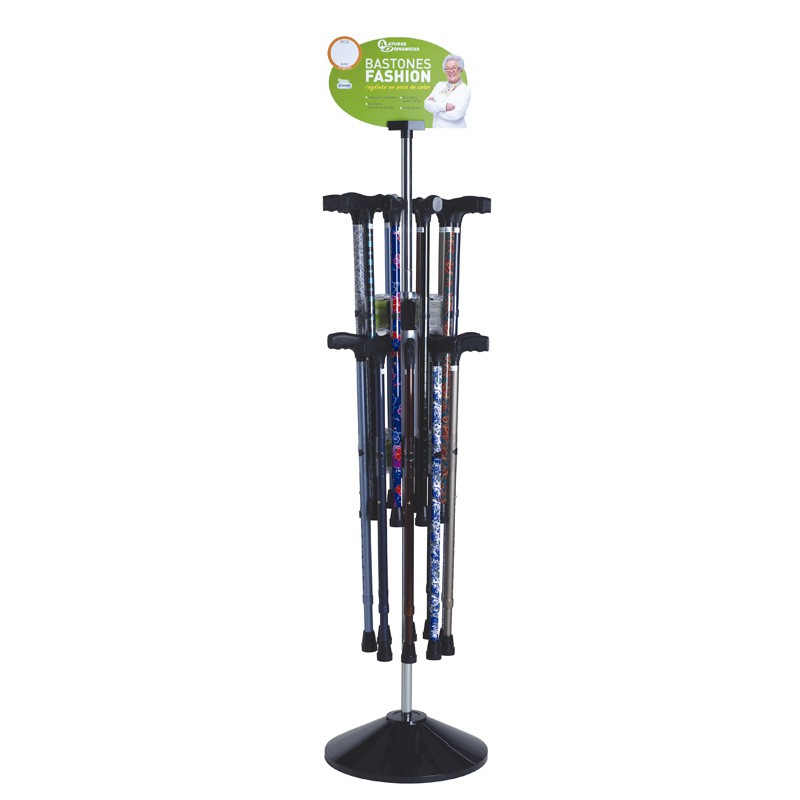 Lleno de colorido y alegre expositor giratorio del que cuelgan 20 bastones FASHION. Ocupa el mínimo espacio. Coronado con una gruesa cartulina que publicita a dos caras las cualidades y el PVP de los bastones expuestos. Disponible en 2 opciones: