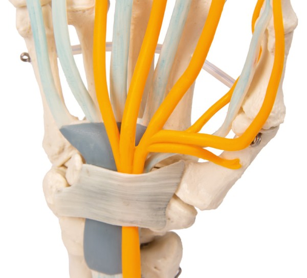 El esqueleto está montado sobre alambre y se compone de huesos individuales. El modelo muestra las siguientes estructuras: tendones del músculo flexor digitorum superficialis, tendón del músculo flexor pollicis longus, vagina communis tendinum musculorum flexorum (vaina flexora común de la mano), ligamento transverso del carpo y nervio mediano. Tamaño natural.