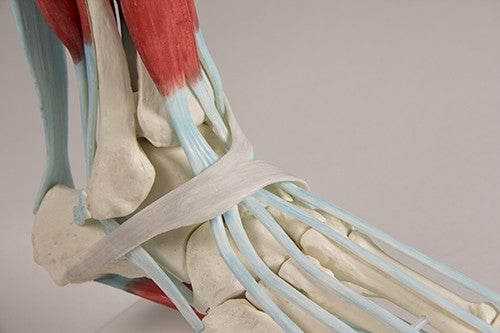 Esqueleto de pie de tamaño natural con representación del aparato ligamentoso con músculos relacionados. Todos los huesos del pie, así como el comienzo de la tibia y el peroné, se representan por separado. Los siguientes músculos con ligamentos están presentes: Músculo flexor largo de los dedos, Músculo tibial posterior, Músculo flexor largo del dedo gordo, Músculo peroneo largo, Músculo peroneo corto, Músculo extensor largo del dedo gordo, Músculo extensor largo de los dedos, Músculo tibial anterior, Retináculo fibular superior, Extensor inferior retináculo del pie, músculo sóleo y músculo Flexor digitorum brevis. Con soporte extraíble y Key Card en latín, alemán e inglés.