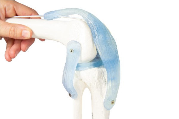 Fundición natural de una articulación de rodilla humana. Con muñones de fémur y parte inferior de la pierna. Los tendones de inserción del músculo recto del muslo, rótula con tendones rotulianos, ligamentos laterales, meniscos y ligamentos cruzados están fabricados en material sintético elástico. Se pueden demostrar los principales movimientos de la articulación de la rodilla, como la flexión y extensión y la rotación externa e interna. Con soporte extraíble.