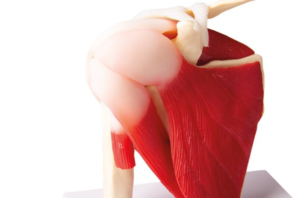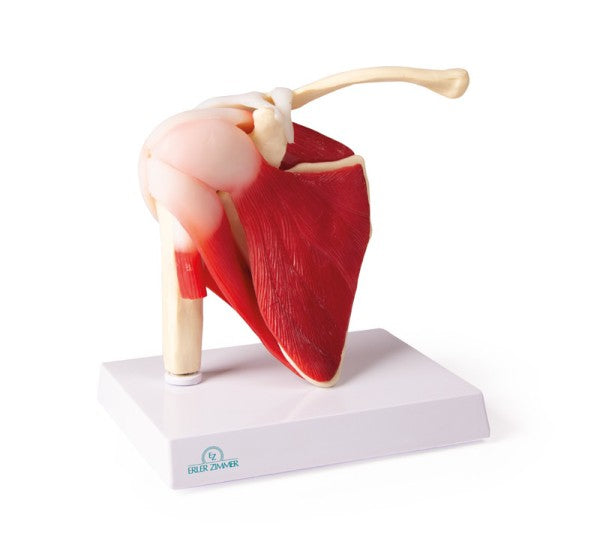 Articulación del hombro humano en tamaño natural con manguito rotador (supraespinoso, infraespinoso, redondo menor, redondo mayor y músculo subescapular), así como el tendón del bíceps braquial. La articulación tiene una movilidad limitada. Con carnet educativo alemán/inglés. En Stand.