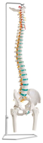 Columna vertebral flexible de tamaño natural que consta de la placa occipital; vértebras cervicales, torácicas y lumbares; sacro; cóccix; pelvis completa con sínfisis; y cabezas de fémur removibles. El modelo también presenta representaciones de las arterias vertebrales, las ramas de los nervios espinales y un disco intervertebral L3-L4 prolapsado. Montado en un soporte para colgar.
