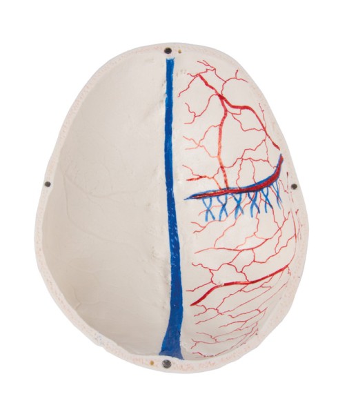 La calota se secciona horizontalmente dejando intactos el hueso temporal y sus suturas. Se han pintado impresiones óseas del seno sagital superior, el seno transverso y el seno sigmoideo, así como los vasos meníngeos. La porción de la base del cráneo ha sido seccionada sagitalmente en la forma en que pasa a través de una placa cribosa en un lado y otra sección en el mismo plano pasa a través de la otra placa cribosa del etmoides dejando intacta la placa perpendicular crista galli del etmoides. como también todo el tabique nasal. Las estructuras de las fosas craneales anterior, media y posterior son fácilmente accesibles. Uno puede visualizar directamente la cavidad nasal, la concha, el tabique nasal, los espacios óseos faríngeos y nasofaríngeos. El tabique nasal es separable de los huesos circundantes. Los senos frontales han sido disecados en un lado para mostrar el seno en su totalidad y en el otro lado cincelado para tener acceso completo al seno. La relación de este seno con la cavidad nasal se muestra claramente y es especialmente valiosa para los otorrinolaringólogos.