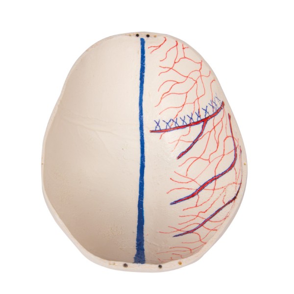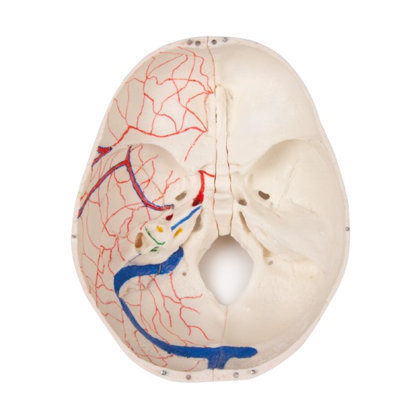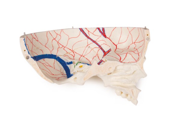 La parte superior del cráneo es abierta y extraíble. Se pintan impresiones óseas del seno sagital, el seno transverso y el seno sigmoideo, así como las meninges. La base del cráneo se corta sagitalmente de tal manera que el corte discurre por una placa tamiz de un lado y otro corte con el mismo plano a través de la otra placa tamiz del hueso etmoides, lo que deja el Christa galli y la placa perpendicular como así como todo el tabique nasal intacto. Las estructuras de la fosa anterior, media y posterior son fácilmente accesibles. Uno puede ver la cavidad nasal, el cornete, el tabique y el hueso y la nasofaringe directamente. El tabique nasal se puede quitar de las estructuras óseas circundantes. El hueso temporal removible muestra un canal auditivo externo completo.