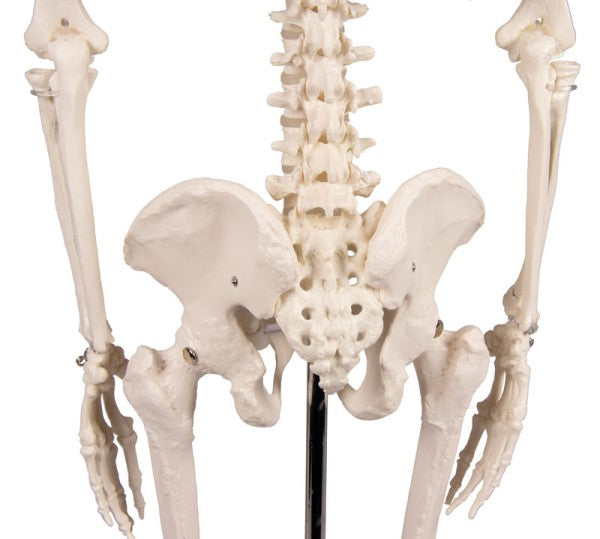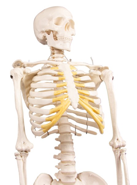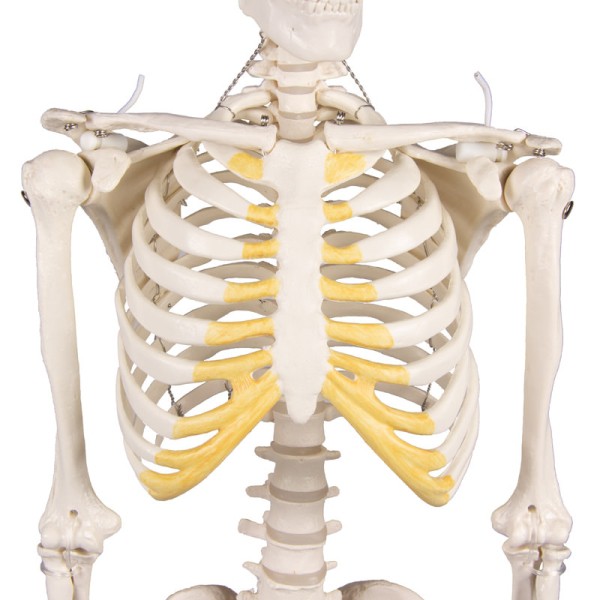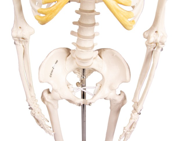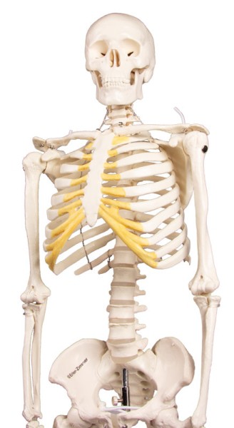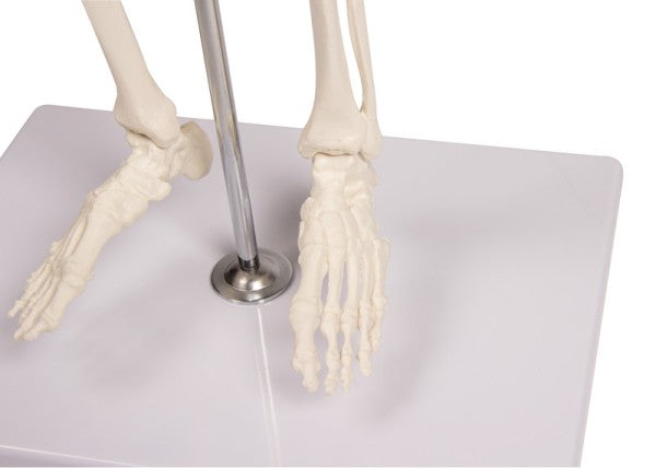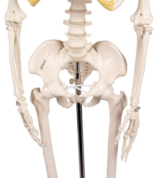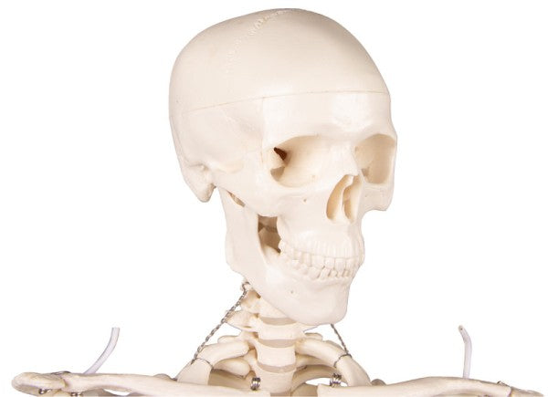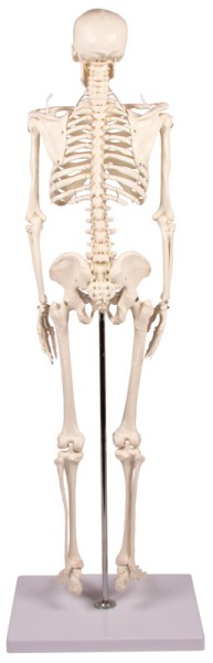 Reproducción reducida de un esqueleto humano en aproximadamente la mitad del tamaño natural. El cráneo, los brazos y las piernas se pueden desarticular. El cráneo se puede desmontar en tres partes.
