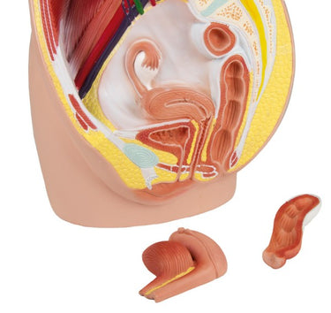 Este modelo de tamaño natural tiene una sección sagital mediana y muestra la pelvis femenina en 3 partes. Además de los músculos y vasos del abdomen, representa particularmente los órganos urogenitales. Se pueden quitar la mitad del útero, la vagina y la vejiga, así como la mitad del intestino con el recto.