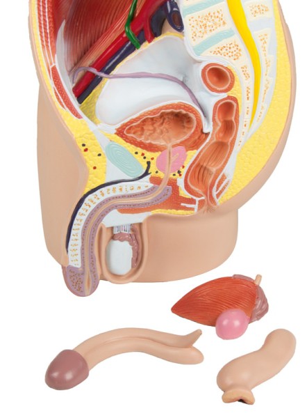 Este modelo de tamaño natural tiene una sección sagital mediana y muestra la pelvis masculina en 4 partes. Además de los músculos y vasos del abdomen, representa particularmente los órganos urogenitales. Se pueden quitar la mitad del cuerpo cavernoso, la mitad de la vejiga con la próstata y la mitad del intestino con el recto.