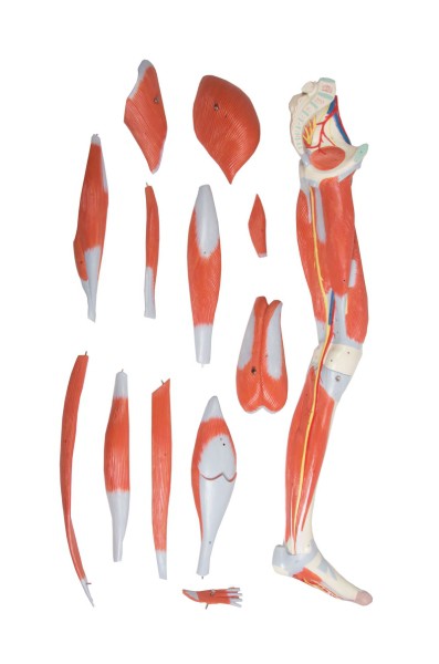 Este modelo de tamaño natural muestra la musculatura de la pierna humana en detalle. Muestra estructuras musculares superficiales y profundas, vasos, nervios y ligamentos. El modelo muestra el pie, la parte inferior y superior de la pierna, así como la mitad de la pelvis.