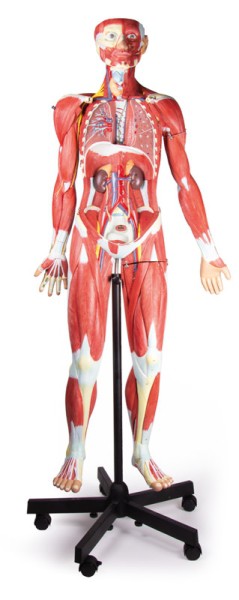 Esta figura musculosa de 32 partes, tiene aproximadamente 2/3 del tamaño natural e incluye un brazo musculoso de 6 partes y una pierna musculosa de 8 partes. Las partes extraíbles incluyen la tapa del cráneo, el cerebro (3 partes), las mitades de los pulmones, el corazón en 2 partes, la tráquea, el esófago, el hígado con la vesícula biliar, el duodeno con el páncreas y el bazo y los intestinos.
