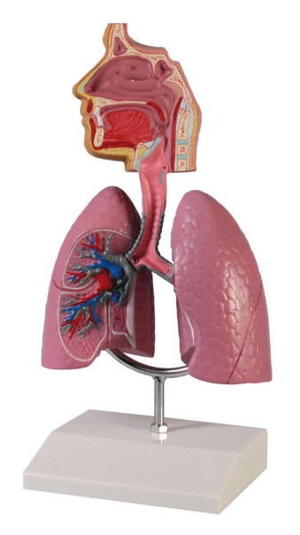 Representación del sistema respiratorio humano en aproximadamente la mitad del tamaño natural. Los pulmones, la tráquea y el tracto respiratorio superior se muestran en detalle. El modelo viene en un soporte extraíble.