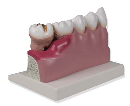 Representación de un maxilar inferior derecho con dientes 3 a 7 con enfermedades y soluciones de tratamiento. Muestra decoloración, caries, infección apical, sarro dental, periodontosis, dientes desvitalizados (3 y 5).