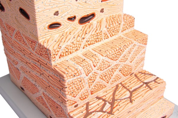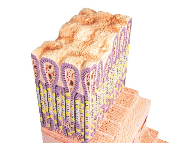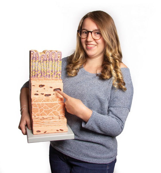 Todas las diferentes capas desde el epitelio hasta la capa serosa están representadas con gran precisión y detalle. Las estructuras principales, incluidos los diferentes tipos celulares, vasos capilares y linfáticos, están numeradas e identificadas en la tarjeta de acceso adjunta. Montado sobre base.