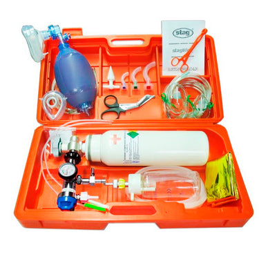 Incluye: Botella de oxígeno medicinal recargable de 2 L, cargada, Regulador de pistón-caudalímetro-aspirador, Sonda de aspiración C-12, Sonda de aspiración C-14, Mascarilla adulto 7 concentraciones, Mascarilla infantil 7 concentraciones, Resucitador de silicona adulto, Abre-boca de plástico, Tira-lenguas de plástico, Manta térmica, Tubos de Guedell nº 1, nº 3 y nº 5, Tubo de silicona 8 x 12, Vaso recolector 500 cc, Maleta polipropileno de 510 x 360 x 110 mm.