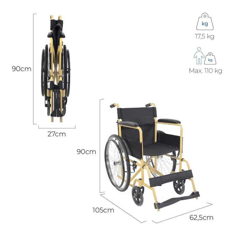 PUERTAS Y MALETERO: Esta silla de ruedas tiene un ancho total de 62.5 cm, por lo que puede pasar por puertas de ancho estándar de 72.5 cm. Además como esta silla plegada mide sólo 27 cm, se puede transportar en el maletero de un vehículo tipo Ford Focus. Asegúrese de las medidas de sus puertas y vehículo para comprobar que le viene bien.