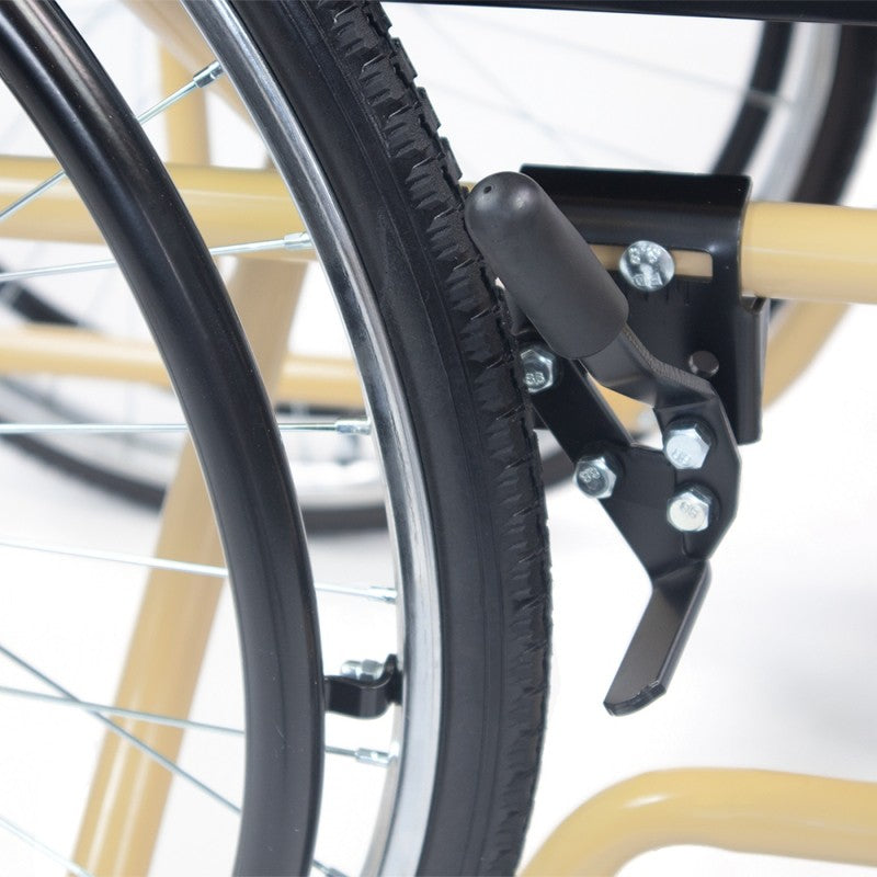BLOQUEO: Si se necesita inmovilizar por completo la silla de ruedas, hay que tirar de la palanca de los frenos, situado al lado de la rueda, hacia delante y las ruedas quedarán bloqueadas. Para desbloquearlas hay que tirar de la palanca hacia atrás
