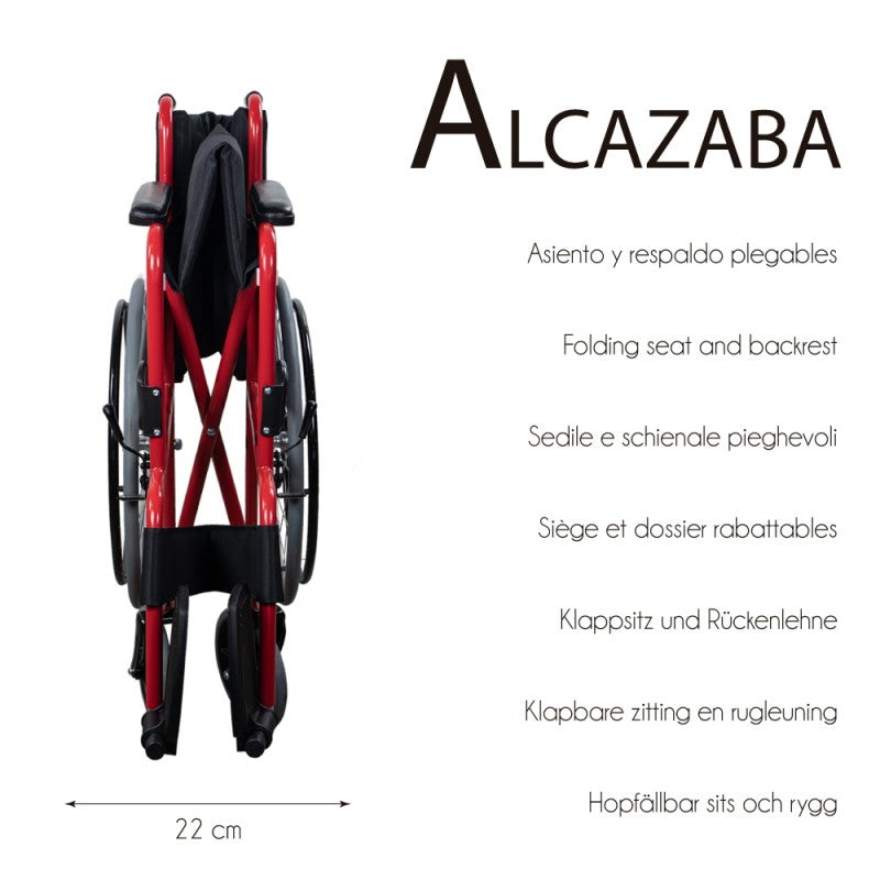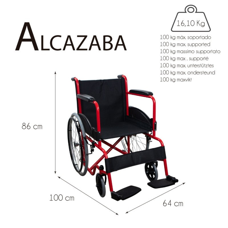 https://www.fisiomarket.com/products/38428-silla-de-ruedas-plegable-alcazaba-reposabrazos-y-reposapies-fijos 9017411928323 Silla de ruedas plegable Alcazaba. Reposabrazos y reposapiés fijos AUTONOMÍA Y SEGURIDAD: esta silla ortopédica esta fabricada con material ignífugo proporcionando mayor protección al cliente y una gran durabilidadPLEGABLE: silla de ruedas plegable fácil de guardar. Se pliega para facilitar el transporteCÓMODA: con ruedas grandes autopropulsables. Reposapiés y reposabrazos firmes y cómodos. Además tiene frenos en las ruedas traseras, la hacen una silla para ancianos segura.BLOQUEO: Si se necesita inmovilizar por completo la silla de ruedas, hay que tirar de la palanca de los frenos, situado al lado de la rueda, hacia delante y las ruedas quedarán bloqueadas. Para desbloquearlas hay que tirar de la palanca hacia atrás.RUEDAS DESMONTABLES: Las ruedas traseras se pueden desmontar a través de un pasador y una tuerca, lo que facilita su almacenaje o transporte.PUERTAS Y MALETERO: Esta silla de ruedas tiene un ancho total de 64 cm, por lo que puede pasar por puertas de ancho estándar de 72.5 cm. Además como esta silla plegada mide sólo 22 cm, se puede transportar en el maletero de un vehículo tipo Ford Focus. Asegúrese de las medidas de sus puertas y vehículo para comprobar que le viene bien.DISPONIBLE TAMBIÉN EN OTROS COLORESDescubre nuestra gama de sillas de ruedas plegable:La silla 'Alcazaba' es una silla de ruedas tradicional, pero que destaca por su seguridad y durabilidad. Sus medidas y su facilidad para el transporte hacen de ella una de las opciones más indicadas para todo tipo de pacientes.Algunas de las características que destacan de esta silla de ruedas plegable modelo 'Alcazaba' son el fácil manejo y gran comodidad debido a la anchura de su silla y su respaldo ergonómico. Por otro lado, sus reposabrazos y reposapiés fijos junto al acero utilizado y tejido ignífugo dan lugar a una silla simple y resistentePor otro lado, tiene una gran facilidad para el plegado, por lo que es perfecta para llevar en cualquier transporte y a cualquier lugar. Dispone de una amplia bolsa para silla de ruedas que nos dará un extra de espacio de almacenaje.La silla de ruedas ortopédica modelo 'Alcazaba' es un estilo de silla que resalta por su gran comodidad y acabado. Su asiento y respaldo ergonómicos permiten ver que es una silla de ruedas moderna, práctica y cómoda. Las ruedas son macizas y no necesitan inflado, por lo que son más resistentes que las ruedas neumáticas tradicionales.No obstante, los reposapiés de la silla de ruedas para ancianos Alcazaba se aprietan con un tornillo situado al final del tubo y para ello se debe utilizar la llave incluida en el producto. En el caso de que desee ajustar la altura de los reposapiés o de que los reposapiés se suelten, se debe apretar este tornillo.Características técnicas de la silla de ruedas ligera:Material: AceroRuedas MacizasRadios de aluminioAltura: 86 cmAncho total (Ruedas incluidas): 64 cmAncho plegado: 22 cmDiámetro rueda trasera: 24"Diámetro rueda delantera: 8"Altura hasta el asiento: 48 cmDistancia entre los puños: 45 cmLargo reposabrazos: 34 cmLongitud de la silla: 100 cmAncho asiento: 44 cmLargo del asiento: 44 cmLargo del respaldo: 44 cmAltura de los reposabrazos respecto al asiento: 29,3 cmAncho entre reposabrazos: 53,8 cm, de largo: 34,3 cmAncho del respaldo: 40cmPeso: 16,10 KgPeso máximo: 100 KgDisponible en varios colores. Nos gusta esta silla ortopédica por: Su peso: lo que le otorga ligereza y facilidad al transportarSu ergonomía: es un producto muy cómodoSu seguridad: proporciona garantías a nuestros clientes. Ficha técnica Dimensiones caja21cm x 87cm x 93cmPeso caja16000gCódigos Ortoprotésicos Cód. Ortoprotésico Cantabria SRM 040A Cód. Ortoprotésico Castilla-La Mancha SRM 040A Cód. Ortoprotésico Extremadura SRM 040A Cód. Ortoprotésico Cataluña SRM 040A Cód. Ortoprotésico Castilla y León SRM 040A Cód. Ortoprotésico Madrid SRM 040A Cód. Ortoprotésico Canarias SRM 040A Cód. Ortoprotésico País Vasco SRM 040A Cód. Ortoprotésico Aragón SRM 040A Cód. Ortoprotésico Andalucía 301 Cód. Ortoprotésico Asturias SRM 040A Cód. Ortoprotésico La Rioja SRM 040A Cód. Ortoprotésico Balerares 12 22 00 110 Cód. Ortoprotésico Comunidad Valenciana 12 21 00 110 Cód. Ortoprotésico Galicia 13 21 00 110 A Cód. Ortoprotésico Murcia SRM 040A https://www.fisiomarket.com/cdn/shop/files/55157.jpg?crop=center&height=300&v=1750526370&width=300 https://www.fisiomarket.com/cdn/shop/files/55157.jpg?crop=center&height=100&v=1750526370&width=100 148.43 148.43 0.0 0.0 instock Ayudas de movilidad Ayudas dinámicas iva10 Mobiclinic Movilidad Novedades Ortopedia Sillas de ruedas Sillas de Ruedas Manuales Sillas de Ruedas Plegables Todos los productos Todos los productos menos Electromedicina Movilidad Ortopedia Sillas de ruedas Mobiclinic 1674638031000