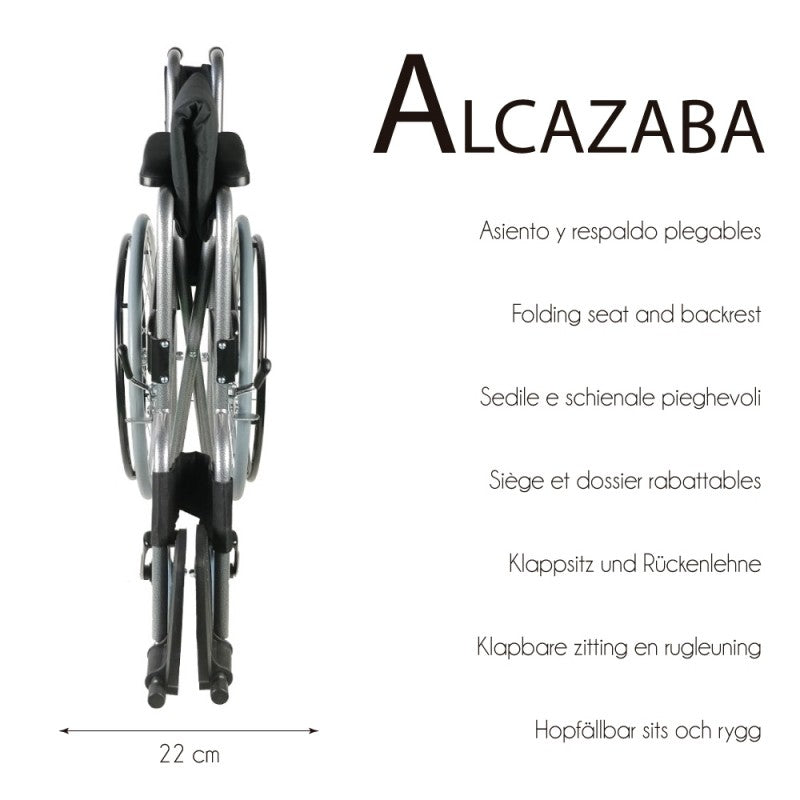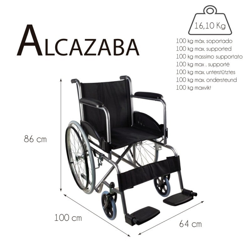https://www.fisiomarket.com/products/38430-silla-de-ruedas-plegable-alcazaba-reposabrazos-y-reposapies-fijos 9017411993859 Silla de ruedas plegable Alcazaba. Reposabrazos y reposapiés fijos AUTONOMÍA Y SEGURIDAD: esta silla ortopédica esta fabricada con material ignífugo proporcionando mayor protección al cliente y una gran durabilidadPLEGABLE: silla de ruedas plegable fácil de guardar. Se pliega para facilitar el transporteCÓMODA: con ruedas grandes autopropulsables. Reposapiés y reposabrazos firmes y cómodos. Además tiene frenos en las ruedas traseras, la hacen una silla para ancianos segura.BLOQUEO: Si se necesita inmovilizar por completo la silla de ruedas, hay que tirar de la palanca de los frenos, situado al lado de la rueda, hacia delante y las ruedas quedarán bloqueadas. Para desbloquearlas hay que tirar de la palanca hacia atrás.RUEDAS DESMONTABLES: Las ruedas traseras se pueden desmontar a través de un pasador y una tuerca, lo que facilita su almacenaje o transporte.PUERTAS Y MALETERO: Esta silla de ruedas tiene un ancho total de 64 cm, por lo que puede pasar por puertas de ancho estándar de 72.5 cm. Además como esta silla plegada mide sólo 22 cm, se puede transportar en el maletero de un vehículo tipo Ford Focus. Asegúrese de las medidas de sus puertas y vehículo para comprobar que le viene bien.DISPONIBLE TAMBIÉN EN OTROS COLORESDescubre nuestra gama de sillas de ruedas plegable:La silla 'Alcazaba' es una silla de ruedas tradicional, pero que destaca por su seguridad y durabilidad. Sus medidas y su facilidad para el transporte hacen de ella una de las opciones más indicadas para todo tipo de pacientes.Algunas de las características que destacan de esta silla de ruedas plegable modelo 'Alcazaba' son el fácil manejo y gran comodidad debido a la anchura de su silla y su respaldo ergonómico. Por otro lado, sus reposabrazos y reposapiés fijos junto al acero utilizado y tejido ignífugo dan lugar a una silla simple y resistentePor otro lado, tiene una gran facilidad para el plegado, por lo que es perfecta para llevar en cualquier transporte y a cualquier lugar. Dispone de una amplia bolsa para silla de ruedas que nos dará un extra de espacio de almacenaje.La silla de ruedas ortopédica modelo 'Alcazaba' es un estilo de silla que resalta por su gran comodidad y acabado. Su asiento y respaldo ergonómicos permiten ver que es una silla de ruedas moderna, práctica y cómoda. Las ruedas son macizas y no necesitan inflado, por lo que son más resistentes que las ruedas neumáticas tradicionales.No obstante, los reposapiés de la silla de ruedas para ancianos Alcazaba se aprietan con un tornillo situado al final del tubo y para ello se debe utilizar la llave incluida en el producto. En el caso de que desee ajustar la altura de los reposapiés o de que los reposapiés se suelten, se debe apretar este tornillo.Características técnicas de la silla de ruedas ligera:Material: AceroRuedas MacizasRadios de aluminioAltura: 86 cmAncho total (Ruedas incluidas): 64 cmAncho plegado: 22 cmDiámetro rueda trasera: 24"Diámetro rueda delantera: 8"Altura hasta el asiento: 48 cmDistancia entre los puños: 45 cmLargo reposabrazos: 34 cmLongitud de la silla: 100 cmAncho asiento: 44 cmLargo del asiento: 44 cmLargo del respaldo: 44 cmAltura de los reposabrazos respecto al asiento: 29,3 cmAncho entre reposabrazos: 53,8 cm, de largo: 34,3 cmAncho del respaldo: 40cmPeso: 16,10 KgPeso máximo: 100 KgDisponible en varios colores. Nos gusta esta silla ortopédica por: Su peso: lo que le otorga ligereza y facilidad al transportarSu ergonomía: es un producto muy cómodoSu seguridad: proporciona garantías a nuestros clientes. Ficha técnica Dimensiones caja21cm x 87cm x 93cmPeso caja16000gCódigos Ortoprotésicos Cód. Ortoprotésico Cantabria SRM 040A Cód. Ortoprotésico Castilla-La Mancha SRM 040A Cód. Ortoprotésico Extremadura SRM 040A Cód. Ortoprotésico Cataluña SRM 040A Cód. Ortoprotésico Castilla y León SRM 040A Cód. Ortoprotésico Madrid SRM 040A Cód. Ortoprotésico Canarias SRM 040A Cód. Ortoprotésico País Vasco SRM 040A Cód. Ortoprotésico Aragón SRM 040A Cód. Ortoprotésico Andalucía 301 Cód. Ortoprotésico Asturias SRM 040A Cód. Ortoprotésico La Rioja SRM 040A Cód. Ortoprotésico Balerares 12 22 00 110 Cód. Ortoprotésico Comunidad Valenciana 12 21 00 110 Cód. Ortoprotésico Galicia 13 21 00 110 A Cód. Ortoprotésico Murcia SRM 040A https://www.fisiomarket.com/cdn/shop/files/55205.jpg?crop=center&height=300&v=1750526370&width=300 https://www.fisiomarket.com/cdn/shop/files/55205.jpg?crop=center&height=100&v=1750526370&width=100 148.43 148.43 0.0 0.0 instock Ayudas de movilidad Ayudas dinámicas iva10 Mobiclinic Movilidad Novedades Ortopedia Sillas de ruedas Sillas de Ruedas Manuales Sillas de Ruedas Plegables Todos los productos Todos los productos menos Electromedicina Movilidad Ortopedia Sillas de ruedas Mobiclinic 1674639375000