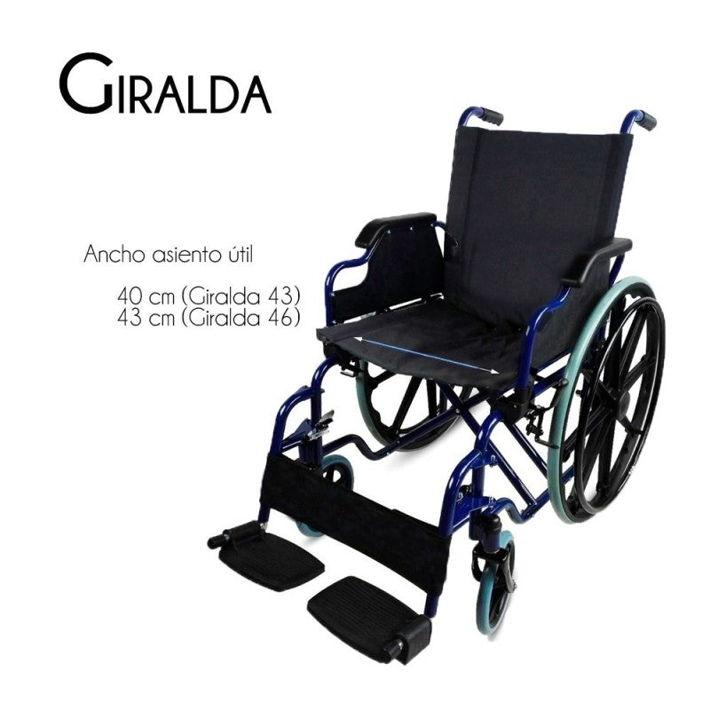 https://www.fisiomarket.com/products/38433-silla-de-ruedas-para-ancianos-plegable-giralda-rueda-grande-premium 9017412124931 Silla de ruedas para ancianos plegable Giralda. Rueda grande, Premium. CÓMODA: para asegurar el mayor confort, la silla modelo Giralda dispone de reposapiés desmontables y reposabrazos abatiblesSEGURA: esta silla está fabricada con elementos ignífugos, lo que aporta una mayor protección al cliente y una gran durabilidadRESISTENTE: el estar fabricada en acero hace que esta silla de ruedas sea un producto duradero y resistente. Así, podrás aprovechar mejor la fuerza de propulsión con eficacia y rigidezIDEAL PARA: ancianos, personas con movilidad reducida, personas en fase de postoperatorio, hospitales, centros comerciales y empresasPLEGABLE: con esta función puedes trasladar tu silla a cualquier lugar, transportarla en el maletero de tu coche o guardarla en casa ocupando menos espacioRUEDAS DESMONTABLES: Las ruedas traseras se pueden desmontar a través de un pasador y una tuerca, lo que facilita su almacenaje o transporte.PUERTAS Y MALETERO: Esta silla de ruedas tiene un ancho total de 58 cm para asiento de 43 cm y 60 cm para asiento de 46 cm, por lo que puede pasar por puertas de ancho estándar de 62.5 cm. Además como esta silla plegada mide sólo 26 cm para asiento de 43 cm y 28 cm para asiento de 46 cm, se puede transportar en el maletero de un vehículo tipo Ford Focus. Asegúrese de las medidas de sus puertas y vehículo para comprobar que le viene bien.La silla de ruedas modelo Giralda es la silla de ruedas de acero que reúne todo lo necesario para mejorar tu calidad de vida: seguridad y resistencia.El estilo compacto de esta silla plegable económica que incluye doble barra de seguridad consigue una enorme resistencia sin perder su ligereza.Tiene asiento y respaldo ergonómicos que se acomodan espléndidamente al cuerpo humano, lo que supone una increíble comodidad y confort a los pacientes.Su material ignífugo, además, otorga una mayor seguridad.Por otro lado, es una silla cómoda, los reposabrazos son completamente abatibles, lo que permite situar a los pacientes cómodamente.Los frenos ultraseguros cuentan con una estructura de ajuste a la rueda que se acciona sin esfuerzo, así como una doble cruceta que permite una gran firmeza.Además, los reposapies abatibles y desmontables, hacen que la posición de pies y piernas sea la idónea, disminuyendo al máximo úlceras por presión.Esta silla de ruedas estrecha tiene ruedas con doble uso, ya que se pueden usar tanto en interiores como en exteriores.Para finalizar, el respaldo posee una bolsa trasera para guardar todo lo que necesites de forma segura.Estas son las increíbles prestaciones de la silla de ruedas manual y plegable Giralda, además, a un precio sin competencia.El manual de instrucciones incluido se encuentra en español, inglés, francés, italiano, alemán y portugués. Características técnicas de la silla de ruedas plegable: Material: AceroDisponible en varios coloresReposabrazos abatiblesReposapiés extraíblesRuedas macizasRadios magAnchura total: 58.5 cmLargura total: 96,5 cmAltura: 90,5 cmAncho total (Ruedas incluidas): 58,5 cm (Giralda 43) / 61 cm (Giralda 46)Ancho plegado: 25,7cm (Giralda 43) / 26,5 cm (Giralda 46)Largo plegado: 91,5 cmAlto: 90,5 cmDiámetro rueda trasera: 58 cmDiámetro rueda delantera: 19,5 cmAncho del asiento: 43 cmLargo del asiento: 41,5 cmAltura del asiento: 48 cmAncho del respaldo: 40,5Respaldo- asiento:42,5 cmAncho de los reposabrazos: 5 cmLargo de los reposabrazos: 41 cmAlto de los reposabrazos: 22 cmLargo del acolchado de los reposabrazos: 26 cmAncho del acolchado de los reposabrazos: 5 cmAncho de los reposapies: 17 cmAncho entre reposapies: 35,5 cmLargo de reposapies: 14,3 cmResposapies-asiento: 41 cmDistancia entre puños: 34,5 cmAncho de cesta/ bolsillo: 22,5 cmLargo de la cesta/bolsillo: 25,5Distancia desde el eje de las rueda a barras A: 23 cmDistancia entre las barras cruzadas B: 3,5 cmDistancia entre barra inferior lateral a otra C : 48 cmAncho asiento disponible en 43 cm y 46 cmPeso: 18,4 kg (Giralda 43) / 19,73 kg (Giralda 46)Peso máximo: 100 kg. Esta silla de ruedas nos gusta por: Su adaptabilidad: gracias a su diseño ágil y resistente podrá usar la silla tanto en interiores como en exterioresSu seguridad: su estabilidad y el material ignífugo con el que este fabricado aporta la mayor seguridad.Su precio: su relación calidad/precio no tiene competencia en el mercado. Ficha técnica Dimensiones caja28cm x 93cm x 83.5cmPeso caja21000gCódigos Ortoprotésicos Cód. Ortoprotésico Asturias 12 21 00 11 0 A Cód. Ortoprotésico Nacional SRM040A Cód. Ortoprotésico Galicia 12 21 00 11 0 A Cód. Ortoprotésico Navarra 1221 00 06 1102 https://www.fisiomarket.com/cdn/shop/files/55239.jpg?crop=center&height=300&v=1750526381&width=300 https://www.fisiomarket.com/cdn/shop/files/55239.jpg?crop=center&height=100&v=1750526381&width=100 194.5 194.5 0.0 0.0 instock Ayudas de movilidad Ayudas dinámicas iva10 Mobiclinic Movilidad Novedades Ortopedia Sillas de ruedas Sillas de Ruedas Manuales Todos los productos Todos los productos menos Electromedicina Movilidad Ortopedia Sillas de ruedas Mobiclinic 1674642630000