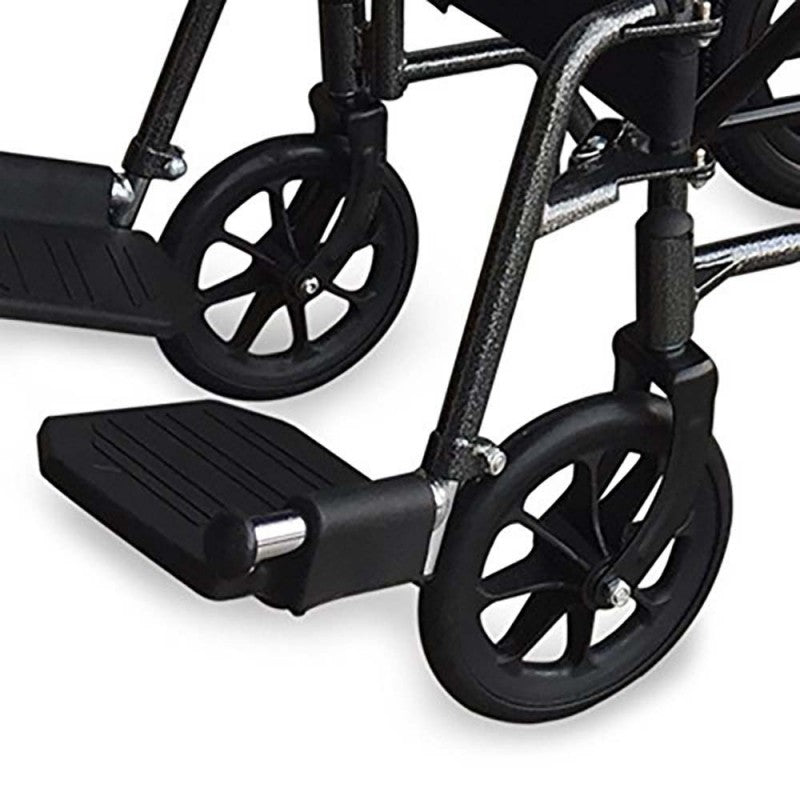 FÁCIL DE USAR: los reposapiés de esta silla de traslado se extraen fácilmente y son regulables en altura para adaptar a la estatura del usuario