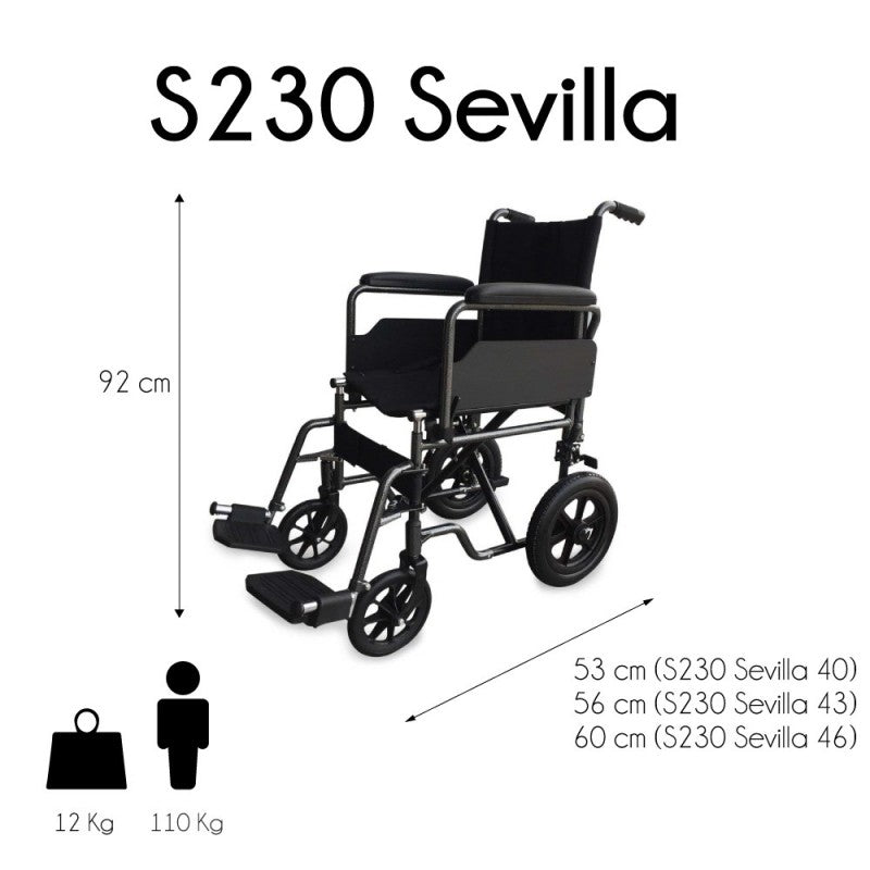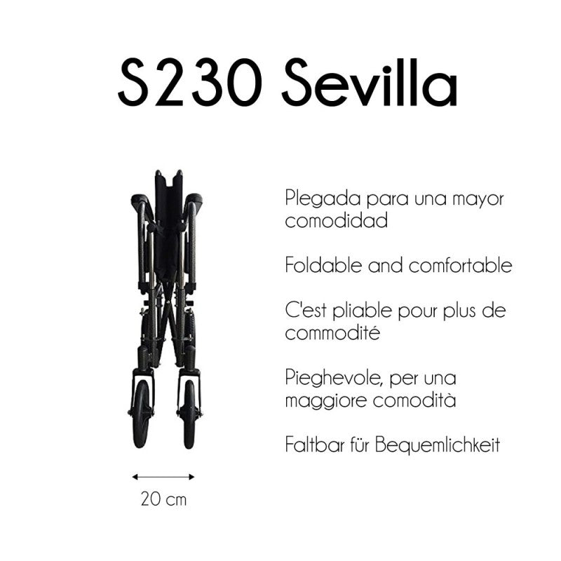 https://www.fisiomarket.com/products/38442-silla-de-ruedas-plegable-s230-sevilla-reposapies-y-reposabrazos-extraibles 9017412419843 Silla de ruedas Plegable S230 Sevilla. Reposapiés y reposabrazos extraíbles. PRÁCTICA Y LIGERA: su diseño con ruedas pequeñas la hacen fácil de guardar, plegar y ligeraFÁCIL DE USAR: los reposapiés de esta silla de traslado se extraen fácilmente y son regulables en altura para adaptar a la estatura del usuarioADAPTABLE: los reposabrazos son movibles para facilitar al cuidador la transferencia del usuario a la silla de ruedas para ancianosDISEÑO ELEGANTE: la silla de ruedas plegable tiene un elegante y discreto diseño con estructura color antracita y tapicería de nylon. Tiene, además, un bolsillo en el respaldo para llevar cosas personalesBLOQUEO: Si se necesita inmovilizar por completo la silla de ruedas, hay que tirar de la palanca de los frenos, situado al lado de la rueda, hacia delante y las ruedas quedarán bloqueadas. Para desbloquearlas hay que tirar de la palanca hacia atrás.RUEDAS DESMONTABLES: Las ruedas traseras se pueden desmontar a través de un pasador y una tuerca, lo que facilita su almacenaje o transporte.PUERTAS Y MALETERO: Esta silla de ruedas tiene un ancho total de 54.5 cm para asiento de 40 cm, 57 cm para asiento de 43 cm y 59.5 cm para asiento de 46 cm, por lo que puede pasar por puertas de ancho estándar de 62.5 cm. Además como esta silla plegada mide sólo 25.5 cm, se puede transportar en el maletero de un vehículo tipo Ford Focus. Asegúrese de las medidas de sus puertas y vehículo para comprobar que le viene bien.¿Por qué comprar una silla de ruedas?A lo largo de toda la vida, cualquier persona puede necesitar algún tipo de ayuda para su movilidad y desplazamiento. Una silla de ruedas proporcionará un apoyo de adaptación, integración social y accesibilidad al individuo inválido o con necesidades especiales que la use.Comprar esta silla de ruedas de acero permite a la persona que la usa adquirir la máxima funcionalidad, comodidad, confort y movilidad que necesita. Por sus medidas y características, esta silla ortopédica es ideal para su uso tanto si se trata de una persona mayor, ancianos, un niño, una persona minusválida, personas con discapacidad física, mental, motriz, pacientes que tienen movilidad reducida, etc.Hablemos de diseño y ergonomía. La silla para minusválidos tiene un elegante diseño, con estructura en color oscuro, tapicería de Nylon acolchado y un bolso trasero para transportar lo que necesites. Está compuesta por asientos anchos (disponible en diferentes medidas), sus reposapiés son regulables, adaptables a la altura del usuario y se pueden extraer fácilmente. Este tipo de silla de ruedas plegables ajustable permite disminuir el peso y las medidas de la silla de ruedas para su movilidad.Además, es plegable para poder transportarla y guardarla fácilmente, lo que la convierte en una silla de ruedas ligera y liviana. Por si fuera poco, sus ruedas son pequeñas y macizas, sinónimo de durabilidad y seguridad, características que la convierten en una silla de ruedas manual de fácil uso. Además, una total seguridad a la hora de prevenir caídas y crear un mayor grado de autonomía e independencia al usuario.Otra de las características distintivas de esta silla de ruedas para ancianos de ruedas pequeñas es que los reposabrazos del usuario son abatibles, algo que facilitará al cuidador la transferencia del paciente desde cualquier sitio a la silla de ruedas.¡Ésta es tu silla! Además, las sillas de ruedas de segunda mano pueden causarte problemas por no contener todos los accesorios o no estar limpias e higiénicas; es mucho mejor para ti y los tuyos si apoyas la movilidad y el descanso de tus ancianos comprando esta silla de ruedas nueva.Se recomienda lubricar el eje de las sillas cada cierto tiempo para que el plegado sea correcto.Características técnicas de la silla de ruedas plegable:Longitud total: 960mmAncho total: 545mm-570mm-595mm dependiendo del asientoAltura total: 920mmAncho de plegado: 255mmAncho del asiento: 400mm-430mm-460mm dependiendo del asientoLargo del asiento: 400mmAltura del respaldo: 410mmRespaldo del asiento al suelo: 480mmAsiento a reposabrazos: 250mmPeso: 12 kg (sin reposabrazos ni reposapiés)Diámetro rueda delantera: 20 cm.Diámetro rueda trasera: 30 cm.Peso máximo soportado: 110 kg. La silla de ruedas manual nos gusta por: Su comodidad: al ser plegable apenas ocupa espacioSu precio competitivo: difícil encontrar por este precio una silla de esta calidad.Su robustez: al estar fabricada en acero es muy resistente. Ficha técnica Dimensiones caja72cm x 96cm x 26cmPeso caja18000gCódigos Ortoprotésicos Cód. Ortoprotésico Asturias 12 21 00 11 0 A Cód. Ortoprotésico Nacional SRM010A Cód. Ortoprotésico Galicia 12 21 00 11 0 A Cód. Ortoprotésico Navarra 1221 00 06 1102 https://www.fisiomarket.com/cdn/shop/files/55418.jpg?crop=center&height=300&v=1750526401&width=300 https://www.fisiomarket.com/cdn/shop/files/55418.jpg?crop=center&height=100&v=1750526401&width=100 169.22 169.22 0.0 0.0 instock Ayudas de movilidad Ayudas dinámicas iva10 Mobiclinic Movilidad Novedades Ortopedia Sillas de ruedas Sillas de Ruedas Manuales Sillas de Ruedas Plegables Todos los productos Todos los productos menos Electromedicina Movilidad Ortopedia Sillas de ruedas Mobiclinic 1674655496000