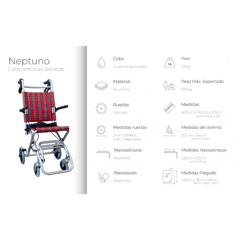 La silla de ruedas 'Neptuno' es un producto para la movilidad perfecta para realizar desplazamientos de forma rápida y segura. Una silla de ruedas de traslado que te permitirá hacer esos desplazamientos cortos de forma rápida, cómoda y segura. Se trata de una silla de tránsito o de viaje, diseñada para uso ocasional y desplazamientos cortos.