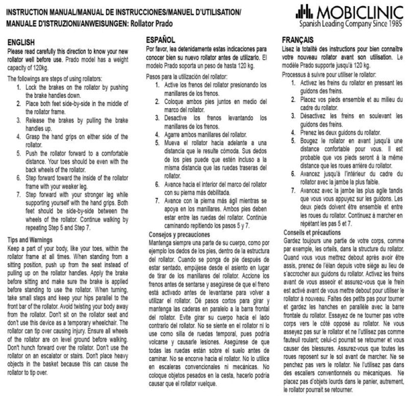 BLOQUEO: Si se necesita inmovilizar por completo el andador, hay que tirar de las manetas de los frenos hacia abajo y las ruedas quedarán bloqueadas. Para desbloquear hay que tirar de las manetas hacia arriba.
