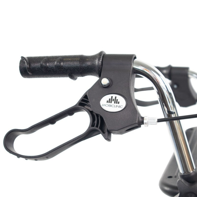 BLOQUEO: Si se necesita inmovilizar por completo el andador, hay que tirar de las manetas de los frenos hacia abajo y las ruedas traseras quedarán bloqueadas. Para desbloquear hay que tirar de las manetas hacia arriba.