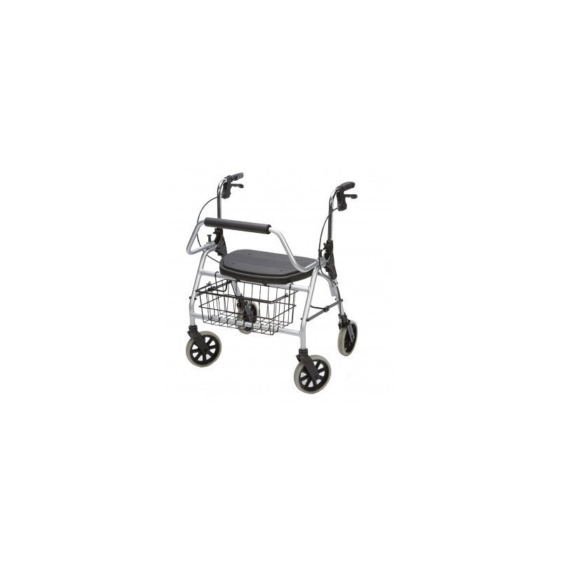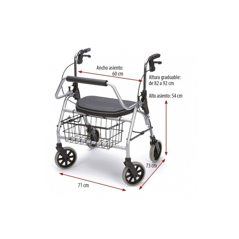 Rolator de aluminio plegable de dimensiones y resistencia para personas de hasta 200 kg. El asiento con respaldo, es blando y de mayores dimensiones de lo habitual para ofrecer mayor comodidad al usuario. Los puños del rolator son de altura graduable con frenos autoblocantes.