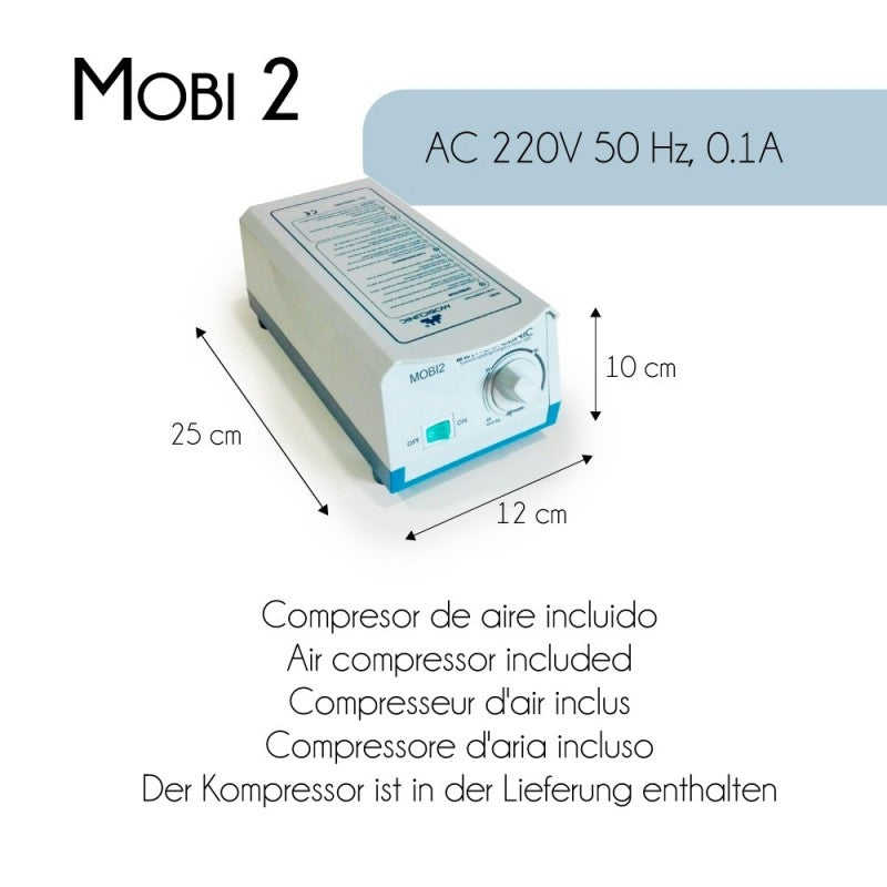 https://www.fisiomarket.com/products/38643-colchon-antiescaras-de-aire-mobi-2 9017418547459 Colchón antiescaras de aire. Mobi 2. MUY ÚTIL: este colchón para escaras está indicado para personas encamadas con un grado 1 y 2 de UPPs (úlceras por presión). Las celdas se inflan y desinflan, adaptándose al peso del usuario (hasta 140 kg)EFICACIA TERAPÉUTICA: con sus 20 celdas que se hinchan y descinchan en periodos de entre 6 y 8 minutos, este colchón ortopédico ayuda a reducir el dolor del paciente y a aliviar la presión que se genera el estar prolongados periodos de tiempo tumbado, mejora la circulación sanguínea y ayuda a reducir la fricción con el colchón de aire y la aparición de escarasRÁPIDO, FÁCIL DE LIMPIAR Y TRANSPORTAR: el colchón antiescaras Mobi 2 está diseñado para permitir que su limpieza y cuidado sea lo más sencillo y fácil posible. Además, gracias a sus medidas y su peso ligero, podrás transportarlo donde te apetezcaACCESORIOS: el colchón antillagas incluye motor compresor y una celda de repuesto. Además, hay disponibles repuestos de colchoneta y compresorSEGURIDAD: este colchón para enfermos encamados está fabricado con PVC de grado medio de máxima calidad y material ignífugoCómo funciona un colchón antiescaras:Este colchón antiescaras cuenta con alternancia de celdas y ajuste según el peso del paciente. Tiene 20 celdas, con un caudal de aire de entre 6 y 8 litros por minuto, recibiendo de esta manera el paciente un constante alivio de la presión, activando la circulación y previniendo la formación de escaras.Este colchón antiescaras con compresor color azul modelo Mobi 2, está indicado para la prevención de úlceras de fase II por presión en pacientes que pasan en cama largos periodos de tiempo. La atención preventiva contra las úlceras por presión o escaras incluye además buenos cuidados de la piel, la mejor nutrición posible, la adopción de una buena postura y los productos antiescaras.Este colchón de aire antiescaras dispone de 20 celdas proporcionando un tratamiento de máxima calidad. El compresor es compacto, fiable y muy silencioso. Además, se puede ajustar a la cama y regular la presión del mismo.Está fabricado con Nylon y PVC de grado médico de máxima calidad y material ignífugo. El colchón terapéutico se limpia fácilmente. El compresor es de fácil manejo.Características técnicas del compresor del colchón antiescaras:Potencia: AC 220V 50 Hz, 0.1AFlujo de aire: 6-8 litros/minutoRango de presión: 40- 100mmHgDuración del ciclo: 6 minutosDecibelios: 33 - 34 dBMedidas: 23cm largo x 11,5cm ancho x 10cm alturaPeso: 1 kgCaracterísticas técnicas del colchón antillagas:Color: AzulFase de escaras I y IIMaterial: Nylon y PVCMedidas hinchado: 200 x 86 x 9,5 cmMedidas deshinchado: 209 x 94 cmDotado de 20 celdasPeso: 3,30 kgPeso máximo del usuario: 140 kgEste colchón antiescaras nos gusta por:La utilidad que tiene para prevenir las escaras.Su ajuste según el peso de la persona.La facilidad con la que se puede limpiar.Los colchones antiescaras NO se pueden devolver una vez que se haya inflado el colchón. Para la devolución de este producto, su embalaje original tiene que estar intacto.Ficha técnicaDimensiones caja36cm x 29.5cm x 23cmPeso caja5500g https://www.fisiomarket.com/cdn/shop/files/56489.jpg?crop=center&height=300&v=1750526679&width=300 https://www.fisiomarket.com/cdn/shop/files/56489.jpg?crop=center&height=100&v=1750526679&width=100 123.42 123.42 0.0 0.0 instock Antiescaras Colchones iva21 Mobiclinic Novedades Todos los productos Todos los productos menos Electromedicina Antiescaras Mobiclinic 1675945386000