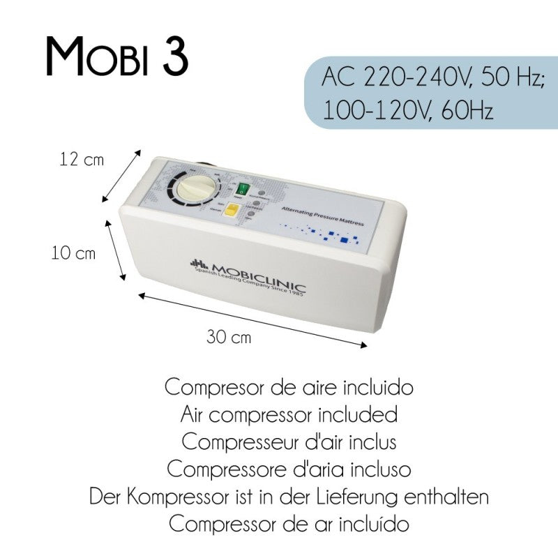 El colchón antiescaras MOBI 3 con celdas de aire, ayuda a mejorar la calidad de vida de los pacientes que tienen que permanecer en cama durante largas temporadas, siendo la solución más eficaz para prevenir la aparición de úlceras y escaras. Contiene un dial para ajustar la presión del aire. Este colchón antillagas es fácil de utilizar y está recomendado para pacientes con un riesgo medio- alto de úlceras por presión, indicado para los de grado I, II y III.