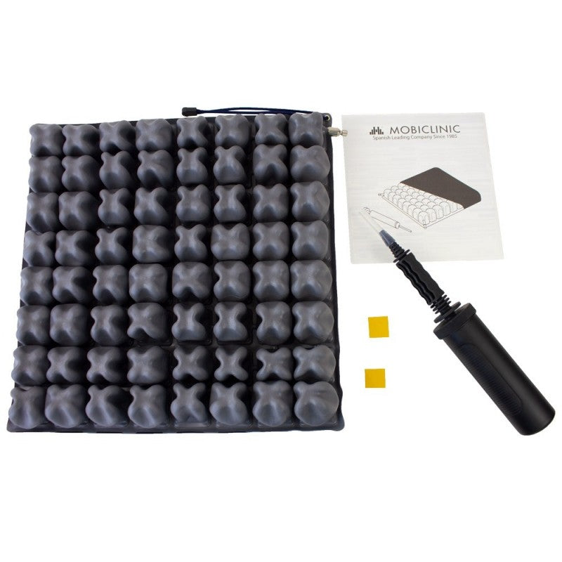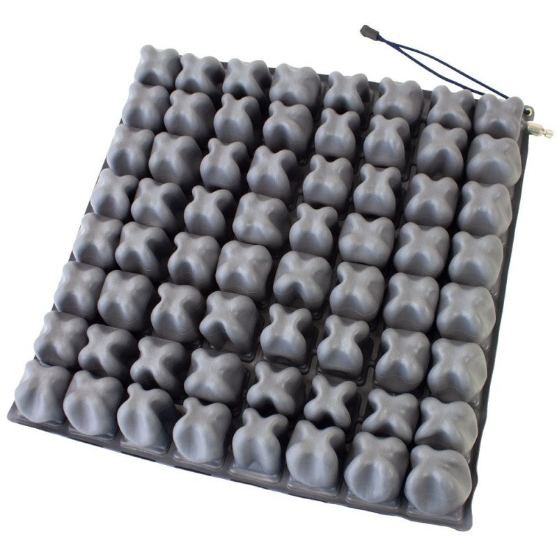 Las celdas son neumáticas e individualmente deformables, para aliviar le presión en las zonas sensibles. Este cojín antiescaras se adapta perfectamente a la forma del cuerpo en cada movimiento del paciente. Las celdas están conectadas entre sí para que el aire circule entre ellas, lo que hace que la presión del cuerpo en contacto con el asiento disminuya y se reparta, facilitando la circulación de la sangre. Además también ayudan a conseguir una postura adecuada.