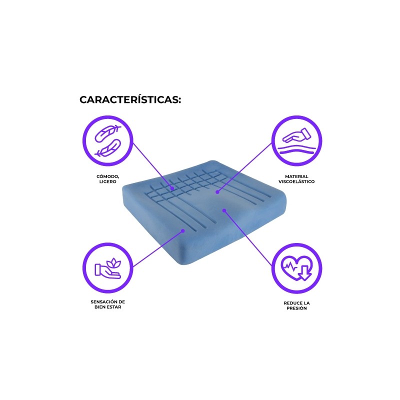 Cojín ergonómico fabricado en espuma viscoelástica con efecto memoria y con inserto ergonómico.
