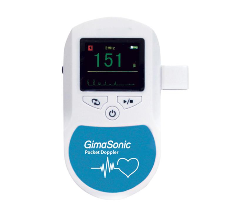 Doppler de bolsillo Gimasonic diseñado con pantalla TFT-LCD a color para la visualización en tiempo real de la frecuencia cardíaca. Incluye sonda de 8 MHz.