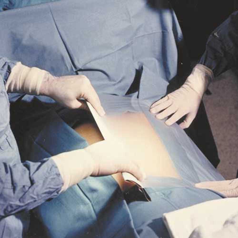 El campo de incisión Steri-Drape está fabricado con una película plástica transpirable que ofrece una gran adhesión. Totalmente impermeable.