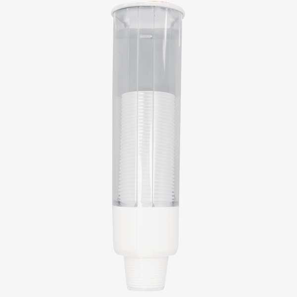 Dispensador de vasos fabricado en plástico, parte central transparente ahumado, partes superior e inferior en blanco.