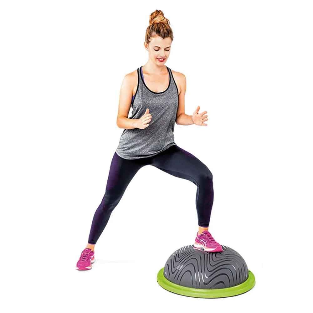 Media bola hecha de plástico especial altamente elástico. Herramienta de entreamiento multifuncional para ejercicios de equilibrio y cordinación. El dinámico efecto trampolín transmite las vibraciones al cuerpo. Utilizable en ambos lados. Presión ajustable individualmente. Incluye bomba Diámetro: 60cm Altura: 22cm