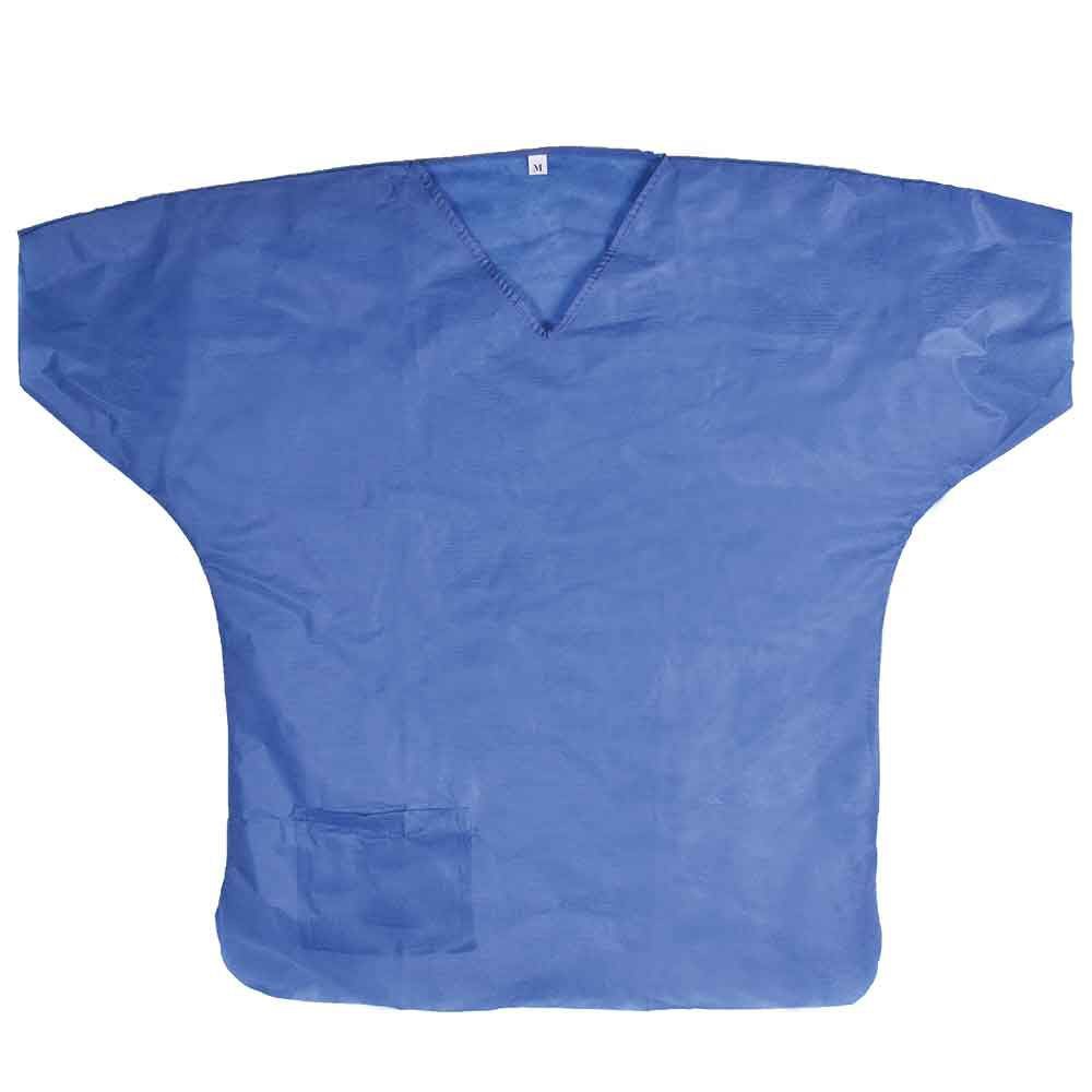Casaca sanitaria desechable, fabricada en tejido sin tejer SMS 38 g/m2 color azul. Dispone de cuello en forma de V, manga corta y un bolsillo a un lado. Esterilizable.