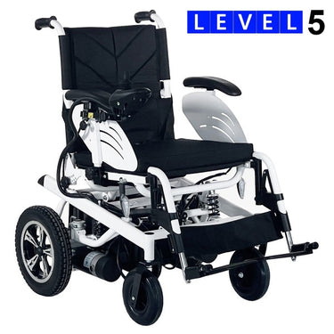 La silla de ruedas eléctrica LEVEL 5 con tracción trasera ofrece un rendimiento de conducción excelente en exteriores porque proporciona una gran estabilidad y rendimiento. Se caracteriza por su nuevo sistema de suspensiones en la parte delantera y trasera del chasis que permite absorber mejor los impactos y mejora la tracción en terrenos exteriores.