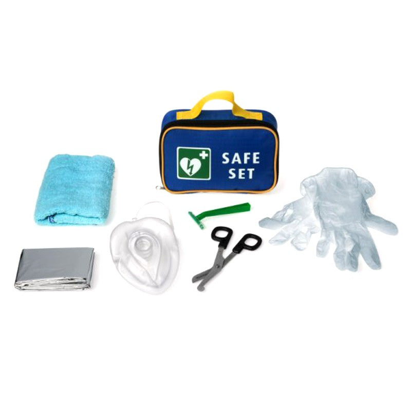 Este set de seguridad contiene todos los artículos relevantes durante la reanimación: tejido de microfibra, manta de rescate, máscara de bolsillo, tijeras, maquinilla de afeitar y guantes.