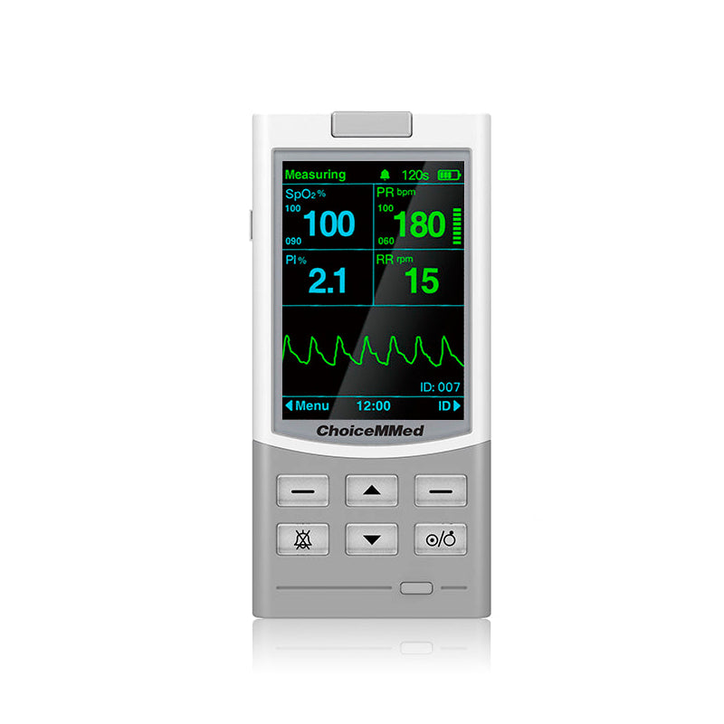 - La pantalla TFT de alta resolución muestra SpO2, PR, RR (frecuencia respiratoria), barra de pulso y forma de onda con retroiluminación de pantalla ajustable.