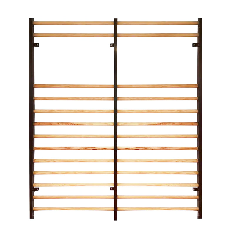 - Espaldera mixta con estructura metálica y listones horizontales ovalados de madera de pino melis de sección 32x27mm.