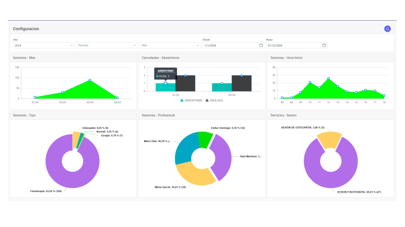 • Estadísticas clave relativas a la facturación y a los servicios que proporcionan información sobre el estado del negocio que te ayuden a tomar decisiones: servicios más demandados, facturación por profesional y por tipo de servicio o producto, tasa de absentismo, etc.