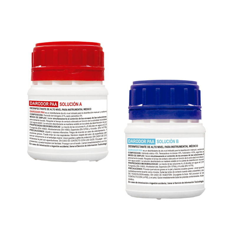 https://www.fisiomarket.com/products/40422-darodor-paa-desinfectante-de-alto-nivel 9017465274627 DARODOR PAA Desinfectante de alto nivel Composición: Solución A (125ml): 5% Ácido Peracético, 25% Peróxido de Hidrógeno. Solución B (125ml): Hidróxido sódico, tensioactivos no iónicos, inhibidores de corrosión y excipientes c.s.p. 100%. Uso de DARODOR PAA:Es un desinfectante concentrado de alto nivel indicado para la desinfección manual de productos sanitarios invasivos tales como endoscopios, material médico-quirúrgico o material termosensible.Propiedades: Pack dúo indivisible: Sistema bicomponente de fácil uso. No requiere activación. Desinfectante de alto nivel de rápida acción biocida: Espectro completo de eficacia acreditado en tan solo 5 minutos. Estabilidad de la solución de uso: 48h. Verificable mediante tiras de control de ácido peracético. Alta compatibilidad con materiales de productos sanitarios invasivos. Modo de empleo: Verter el contenido de las soluciones A y B de DARODOR PAA en la cantidad de agua necesaria y homogeneizar. Sumergir el producto sanitario a desinfectar previamente lavado. Esperar 5 minutos para la desinfección de alto nivel. Una vez finalizado el tiempo de contacto, extraer el material y aclararlo con agua estéril. La solución desinfectante se mantiene estable en la cubeta de desinfección durante un periodo de 48h.Presentación: Caja de 16 packs dúo. 1 pack dúo: Solución A (125ml) + Solución B (125 ml) Tiras de control, 100 unidades por envase (se adquieren por separado, no incluidas con el producto). https://www.fisiomarket.com/cdn/shop/files/61401.jpg?crop=center&height=300&v=1750528247&width=300 https://www.fisiomarket.com/cdn/shop/files/61401.jpg?crop=center&height=100&v=1750528247&width=100 14.17 14.17 0.0 0.0 instock Desinfectantes Higiene y Limpieza Instrumental iva21 Jose Collado Novedades Todos los productos Todos los productos menos Electromedicina Desinfectantes Instrumental Productos Jose Collado 1718270053000