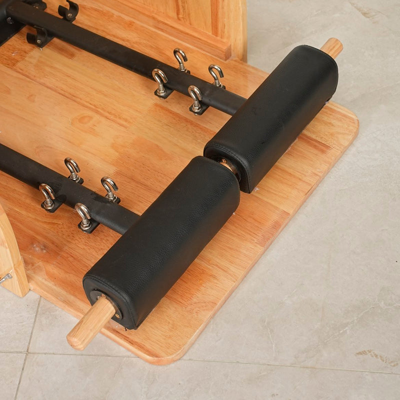 Silla de Pilates de gran estabilidad y resistencia en madera maciza. Acolchado de espuma EVA de alta densidad para mayor comodidad. Con un novedoso sistema de muelles inferiores para resistencia inversa. Tapizado en negro con material lavable y resistente.